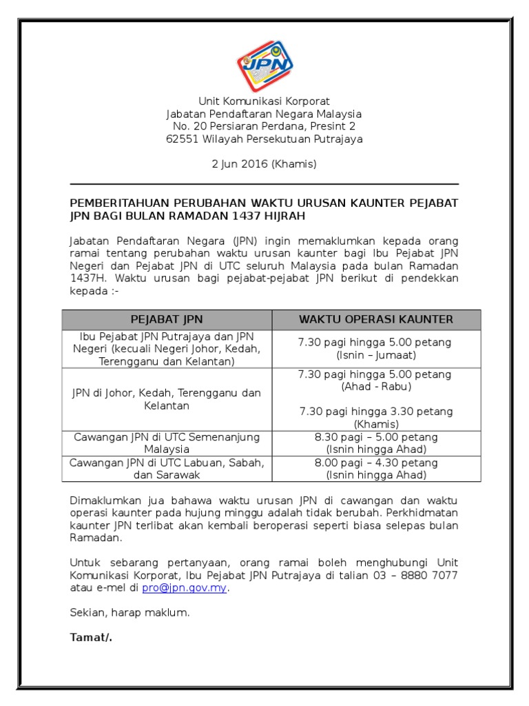 Makluman Hebahan Waktu Operasi Jpn Bulan Ramadhan 1437h Pdf